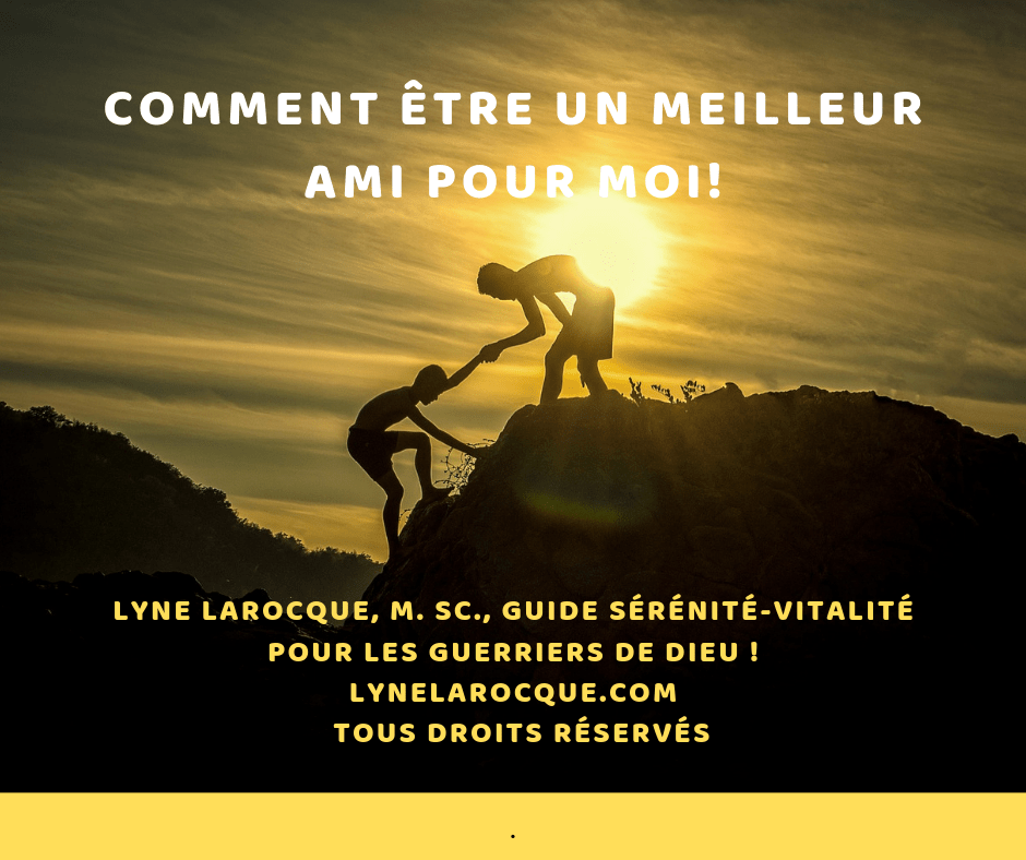 « Je choisis d’apprendre à être un meilleur ami pour moi-même! Je choisi de prendre la responsabilité pour chaque émotion qui émerge en moi et qui me submergent. J’en prends responsabilité, ce qui me permet de gérer mes émotions et de trouver des solutions. De plus en plus à chaque jour, je choisis de faire des pauses, de me centrer, de gérer les émotions qui sont là, de solutionner ce que mon âme me demande de solutionner. De plus en plus à chaque jours, je choisi d’approfondir la sérénité en moi, de mieux m’aimer».