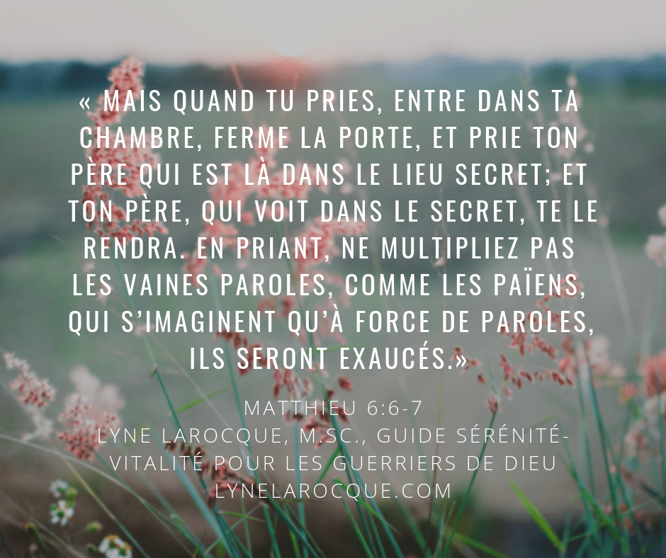 « Mais quand tu pries, entre dans ta chambre, ferme la porte, et prie ton Père qui est là dans le lieu secret; et ton Père qui est là dans le lieu secret; et ton Père, qui voit dans le secret, te le rendra. En priant, ne multipliez pas les vaines paroles, comme les païens, qui s’imaginent qu’à force de paroles, ils seront exaucés.»